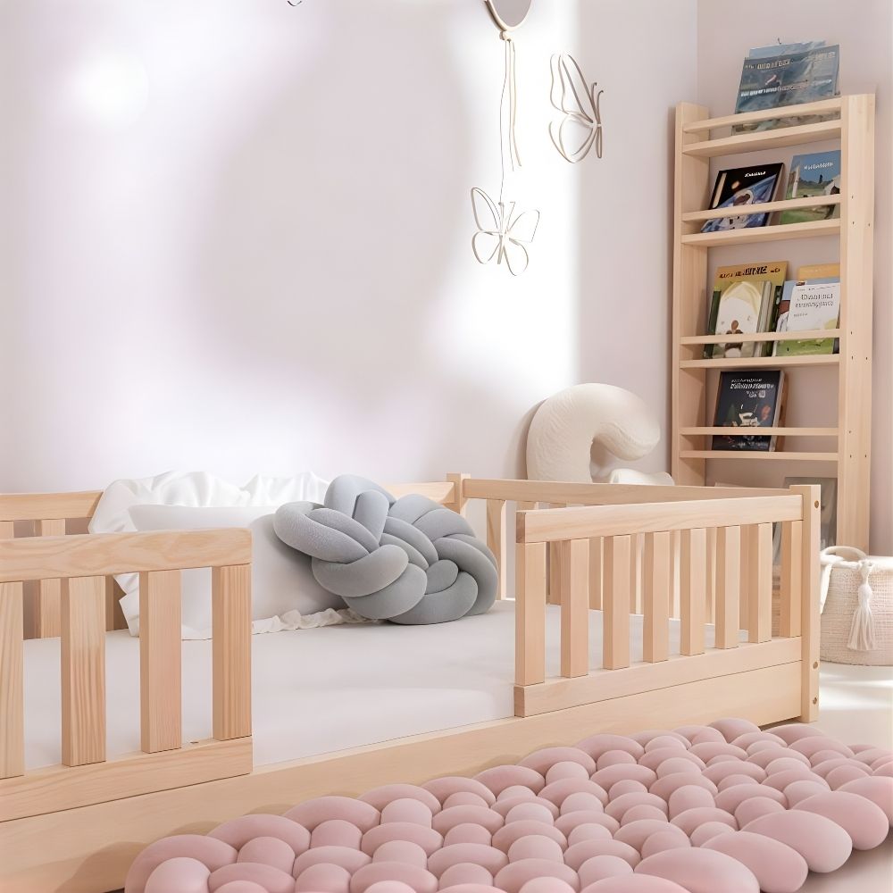 Một số mẫu giường Montessori cho bé được thiết kế thêm thanh chắn thấp xung quanh để tăng độ an toàn cho trẻ nhỏ. Phần chắn này vẫn giữ chiều cao thấp để bé có thể tự ra vào giường một cách dễ dàng.