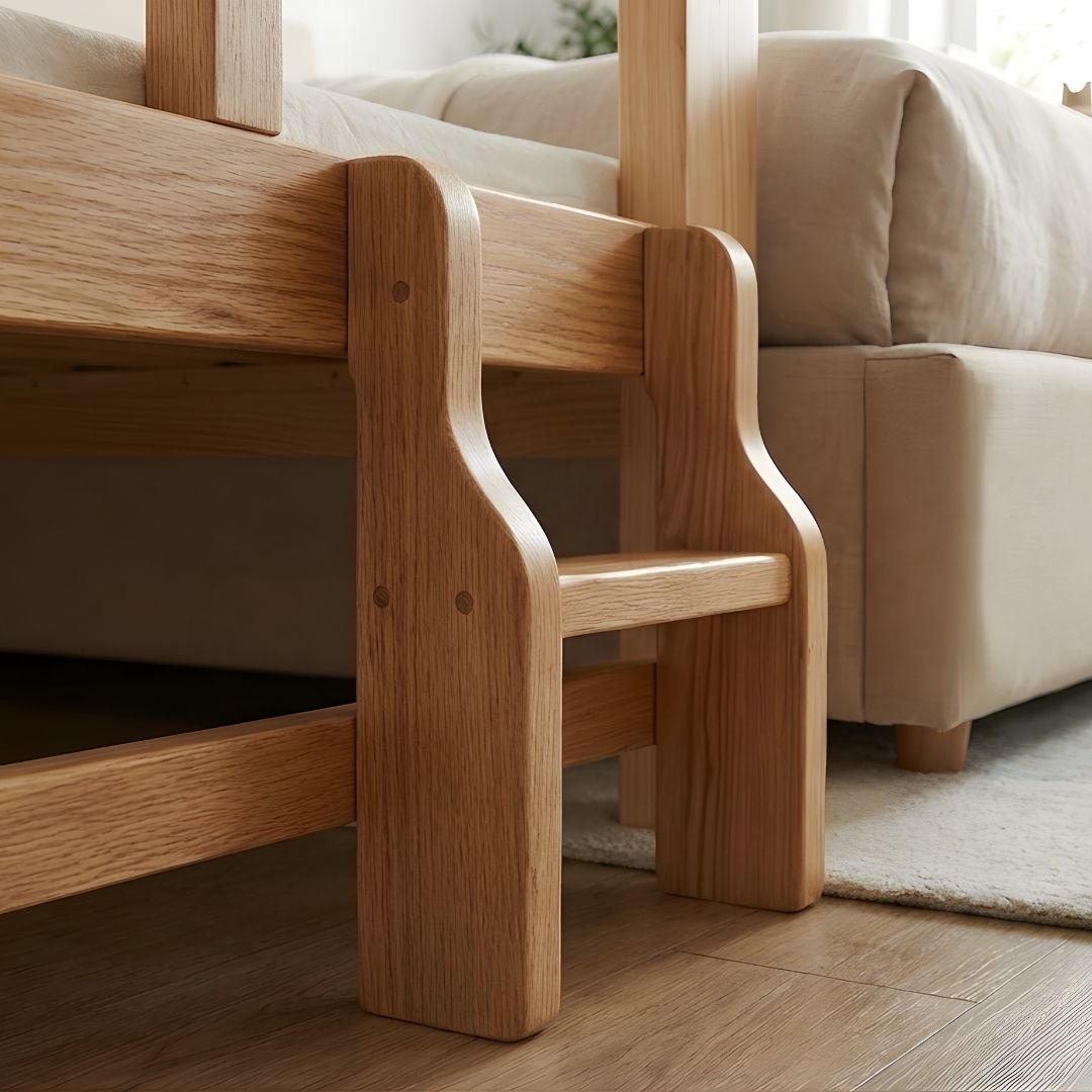 Cầu thang gỗ đi kèm giúp bé dễ dàng leo lên và xuống giường mà không cần bế đỡ. Các bậc thang được bo tròn và xử lý bề mặt mịn, hạn chế trầy xước khi sử dụng.
